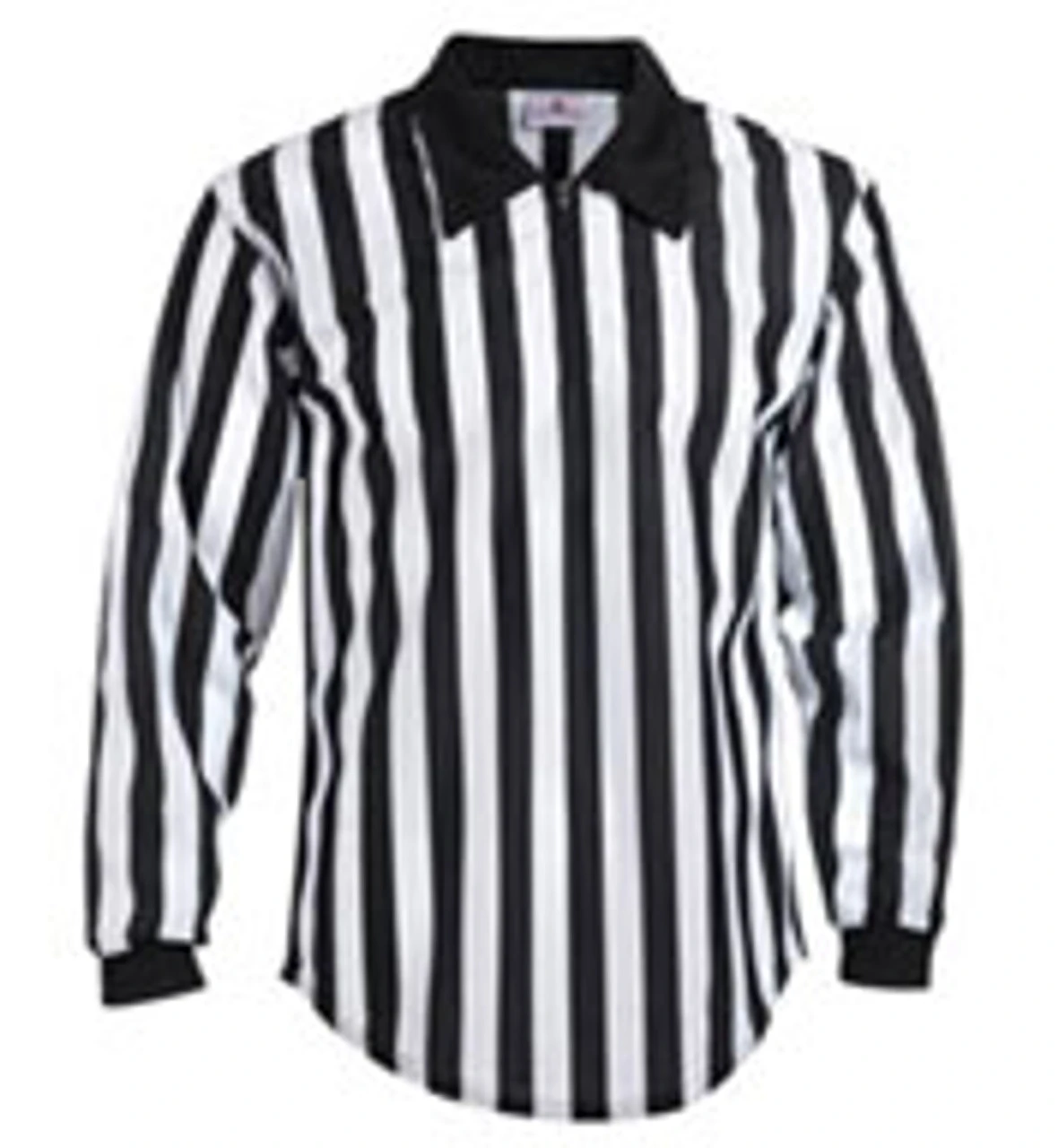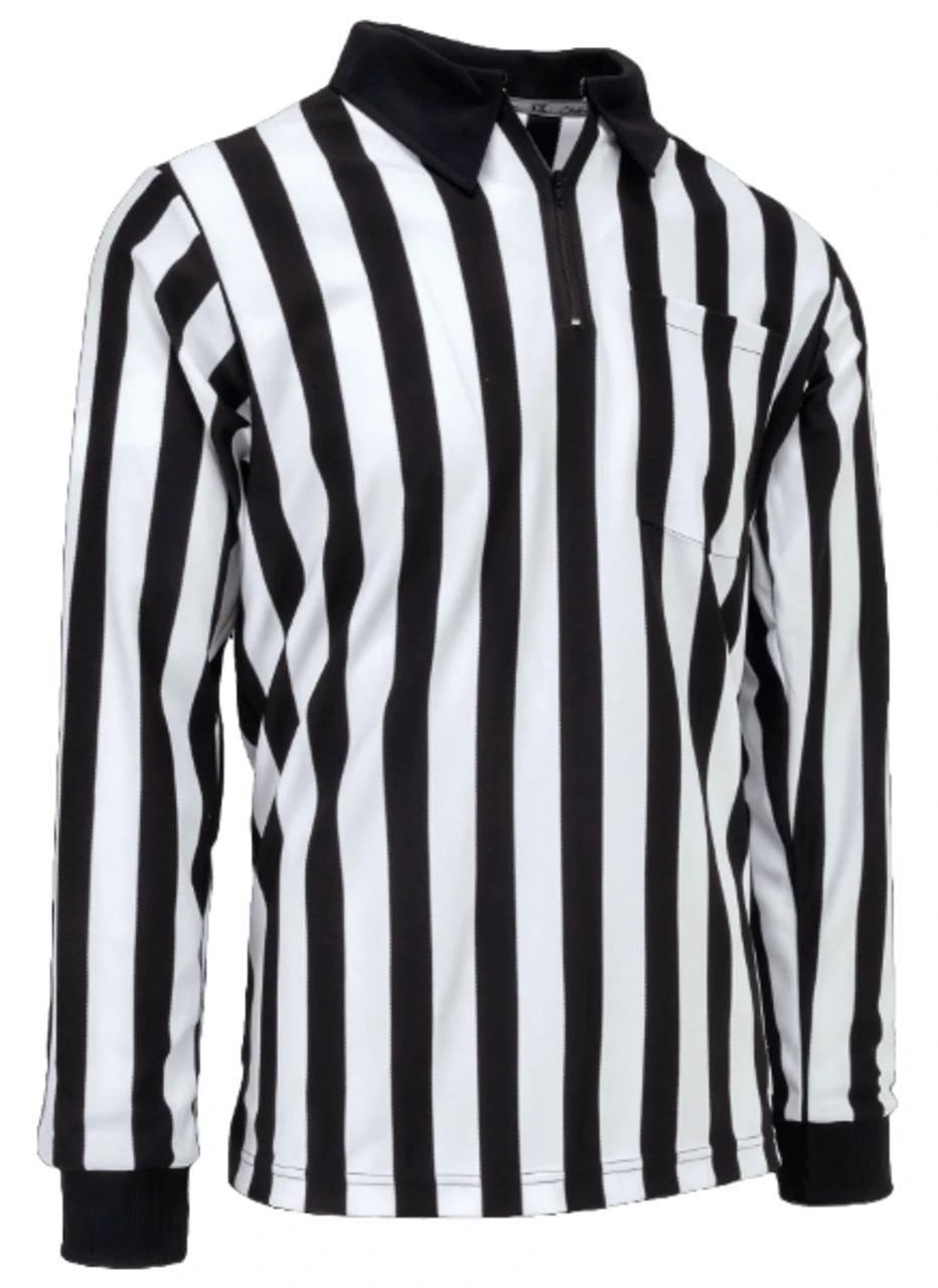 Cliff Keen 1″ Stripe polyester long sleeve football/lacrosse referee shirt. Lightweight EZ-Care polyester fabric keeps you cool and maintains its shape, no matter what Mother Nature throws your way! Shrink, wrinkle, and stain resistant for a durable, long life. Feels like soft cotton against the skin. Vibrant black and optic white stripes. Fortified with our woven fabric technology; it wicks moisture from the body, increasing comfort and providing an intangible performance advantage. Available in Long Sleeves, this is the ideal shirt for those contests where its cool outside, yet not freezing cold. Throw a layer or two underneath however, and you stay plenty warm! Great for both Football & Lacrosse.