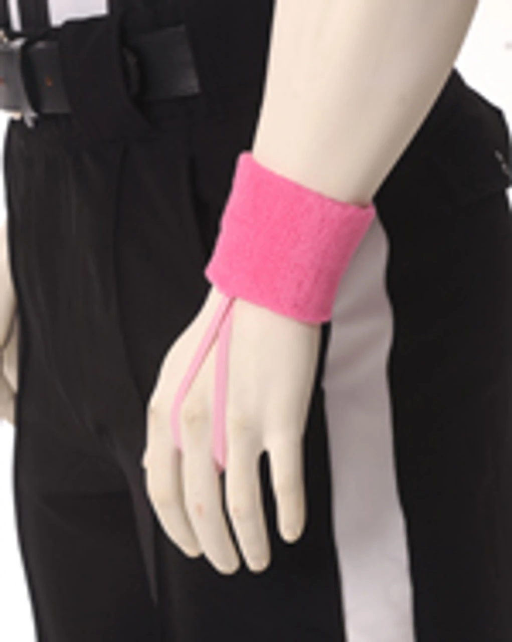 Terry cloth wristband with elastic down indicator strap attached now available in pink. Helps absorb moisture to keep hands drier.