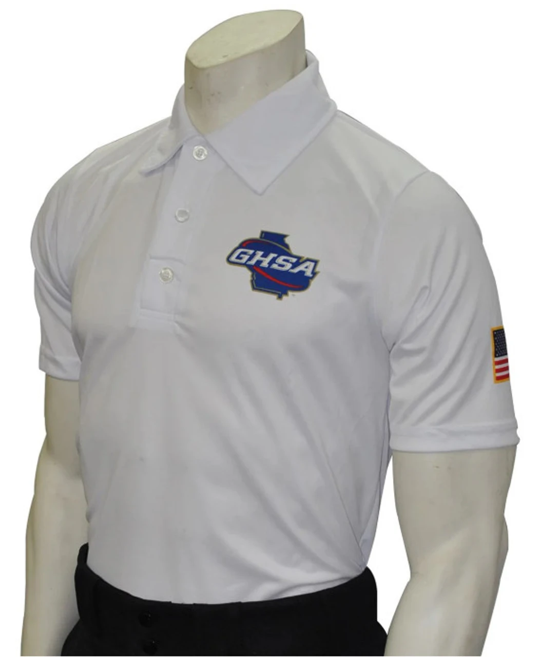 Georgia GHSA Men’s White Dye Sublimated Volleyball & Swimming Referee Shirt. Premium quality 100% polyester closed hole mesh. Wicks moisture away from the body. Heat sealed label. Matching flat knit collar. Top stitched shoulders and armholes. Open hem sleeves. Box-stitched placket. Three matching buttons with cross-stitching. Double-needle hemmed sleeves and bottom. No pocket. Used for volleyball and/or swimming officials.