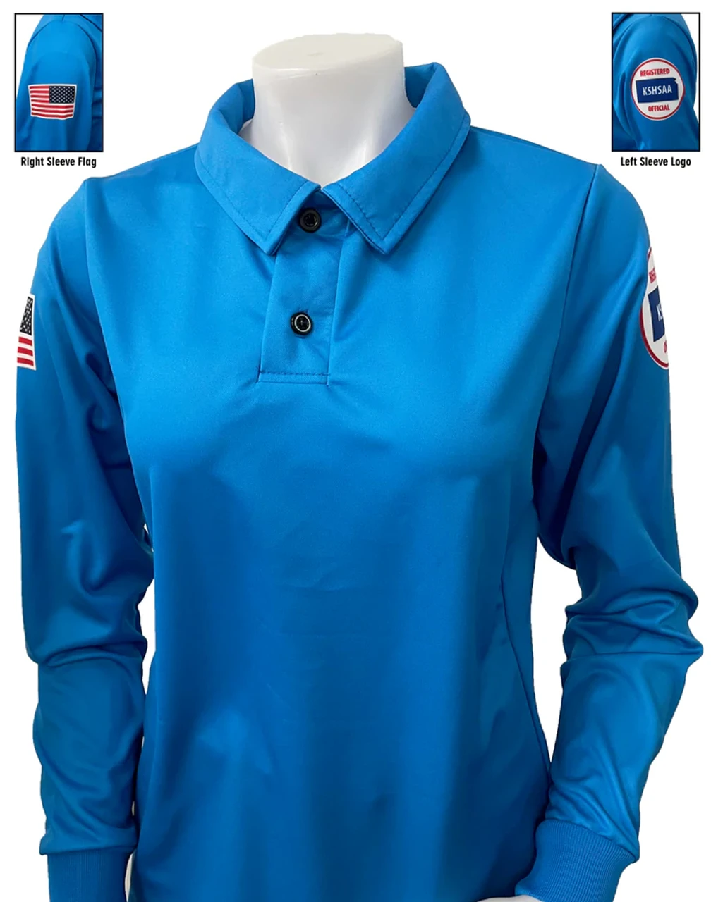 Kansas KSHSAA Women’s Bright Blue Volleyball Referee Shirt With Flag. Kansas KSHSAA long sleeve shirt features the KSHSAA logo dye sublimated on the left sleeve and a white border US Flag on the right sleeve. High-performance 100% polyester performance interlock fabric. Self fabric collar and self hem sleeves. Proudly Made In The USA.
