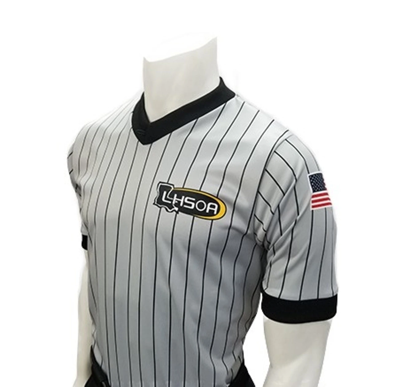 Louisiana LHSOA Dye Sublimated Men’s Wrestling Referee Shirt. Smitty Ultra Mesh shirt for Louisiana officials with the LHSOA logo dye sublimated on the left chest and a white border US Flag on the left sleeve. Lightweight and the cut is so comfortable. A great choice because of it’s high wicking and fast drying properties. ”Tight V” neck opening with loop to attach your lanyard.