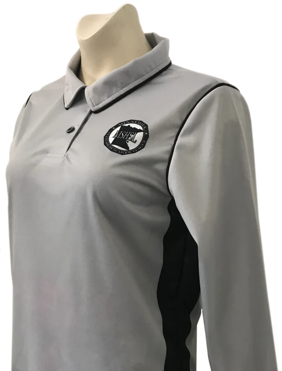 Grey performance polyester performance mesh shirt for Minnesota officials. Minnesota State High School League logo dye sublimated on the left chest. Lightweight and comfortable. A great choice because of it’s high wicking and fast drying properties. ”Tight V” neck opening with loop to attach your lanyard.
