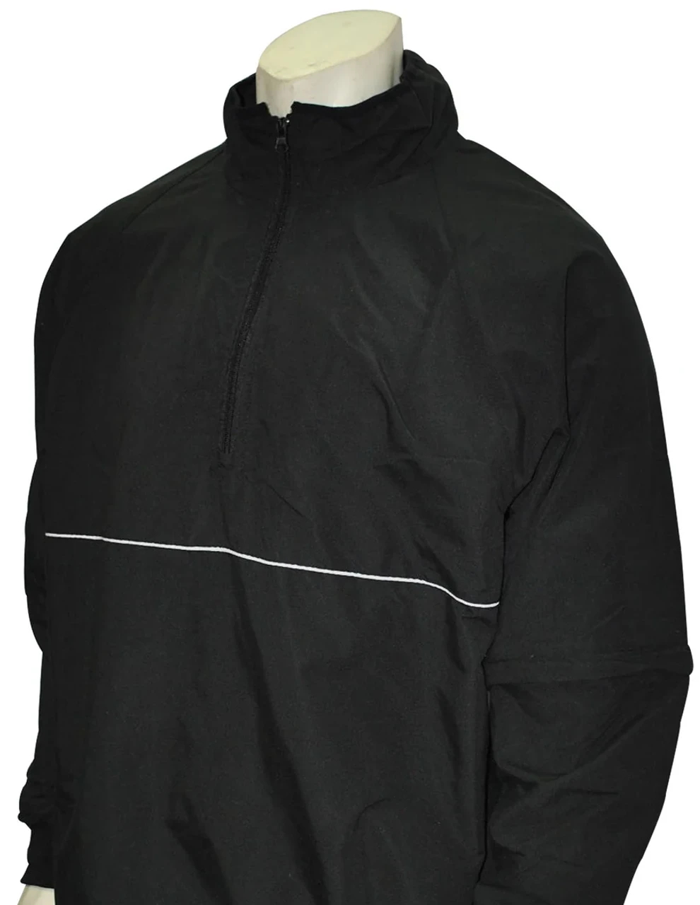 Smitty Pro-Series Convertible Half Sleeve Umpire Jacket. Microfiber shell and nylon lining for breatheability and comfort. Stand-up collar, ribbed knit cuffs and 1/2 zip front. No need to up-size as these jackets are sized for the plate. Thin waistband to be worn outside the pants or tucked in. Sleeves zip off at the elbow to convert to short sleeve jacket for the ever changing weather conditions. White stripe runs horizontal around the body. This versatile pullover will help you adjust to any weather changes on the field! With the weather-resistant microfiber shell, the zip-off sleeves allow you to go from chilly mornings to warmer afternoons in seconds.