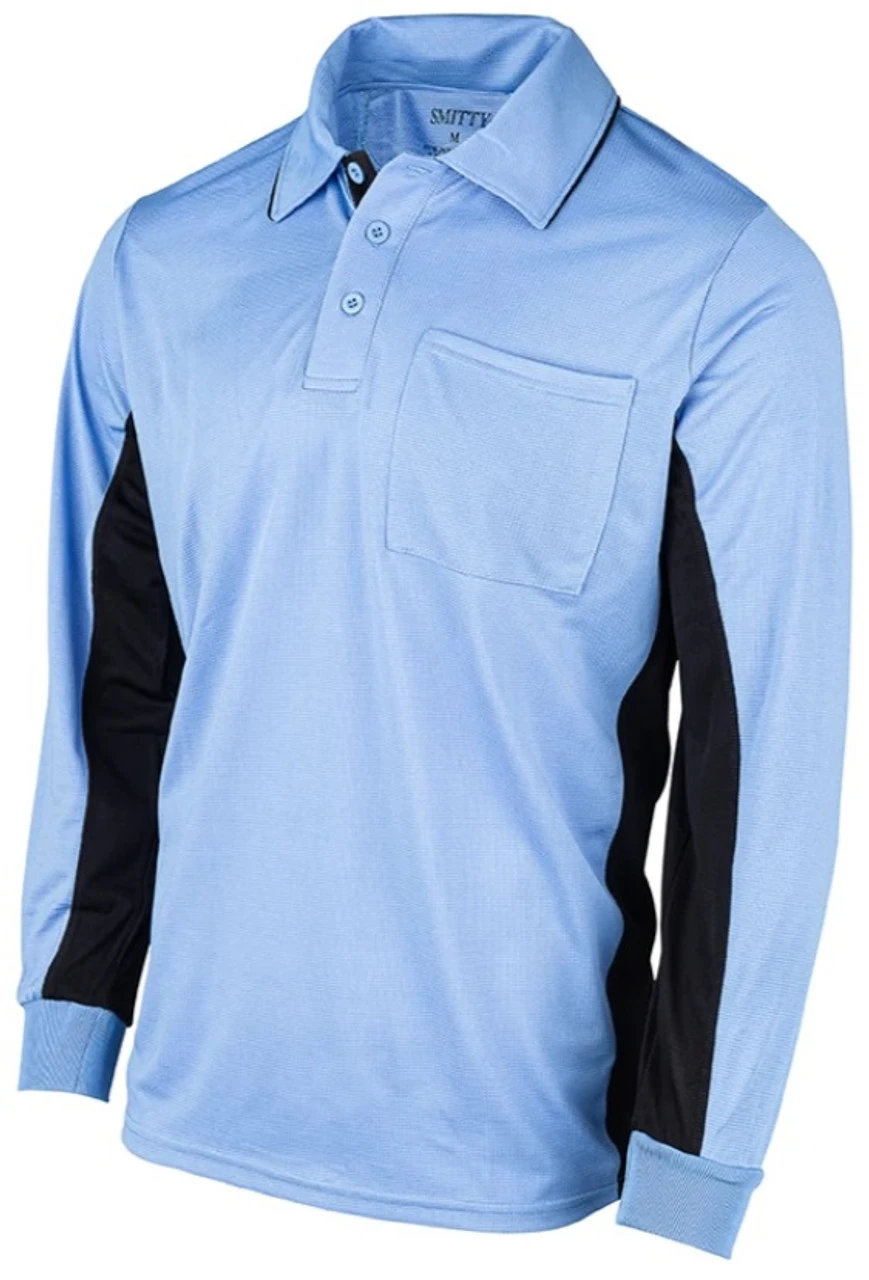Smitty MLB Replica Sky Blue w/Black Side Panel Long Sleeve Umpire Shirt. Long Sleeve version of the extremely popular USA312. Sky blue with black side panel. Self styled collar with black accent trim. Made with performance polyester fabric. Left chest pocket. Rib knit cuffs. This shirt is sized for the plate. You may want to down size for the bases. Good for baseball or softball. Proudly Made In The USA.