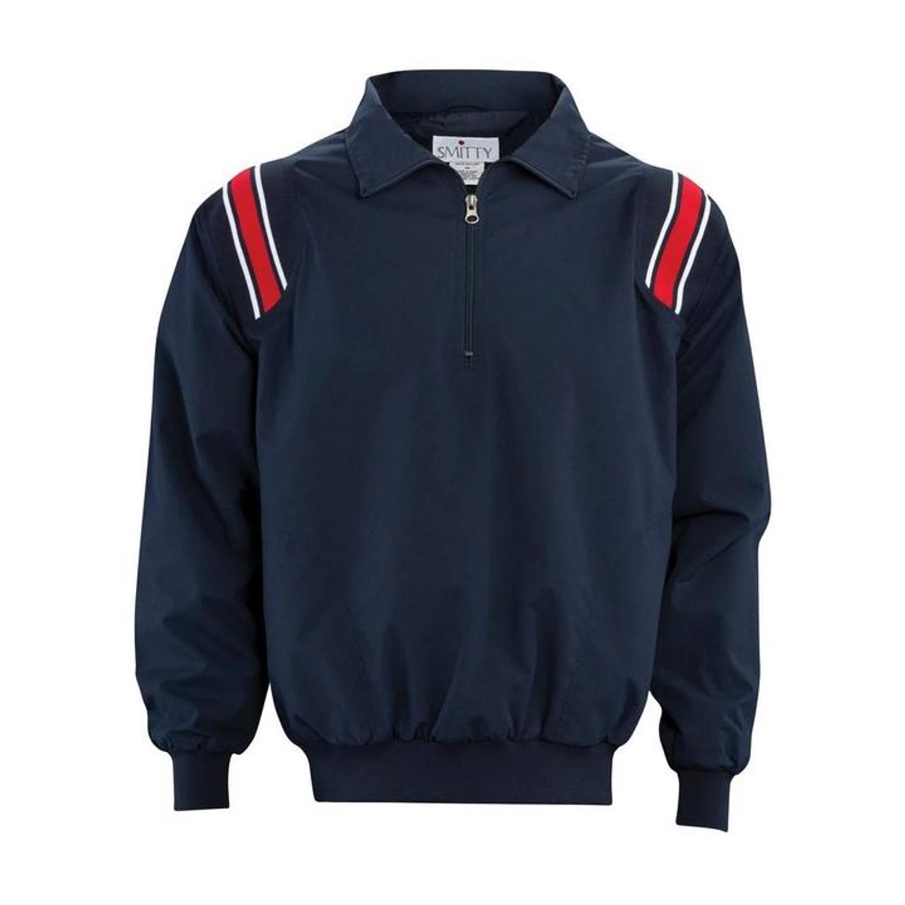 Navy Umpire Pullover with Red and White Trim. Water resistant micro-fiber shell, stand-up collar, nylon lining, and half zipper collar that can lay flat or zip around the neck. Can be worn tucked into your pants or untucked. Side seam pockets.