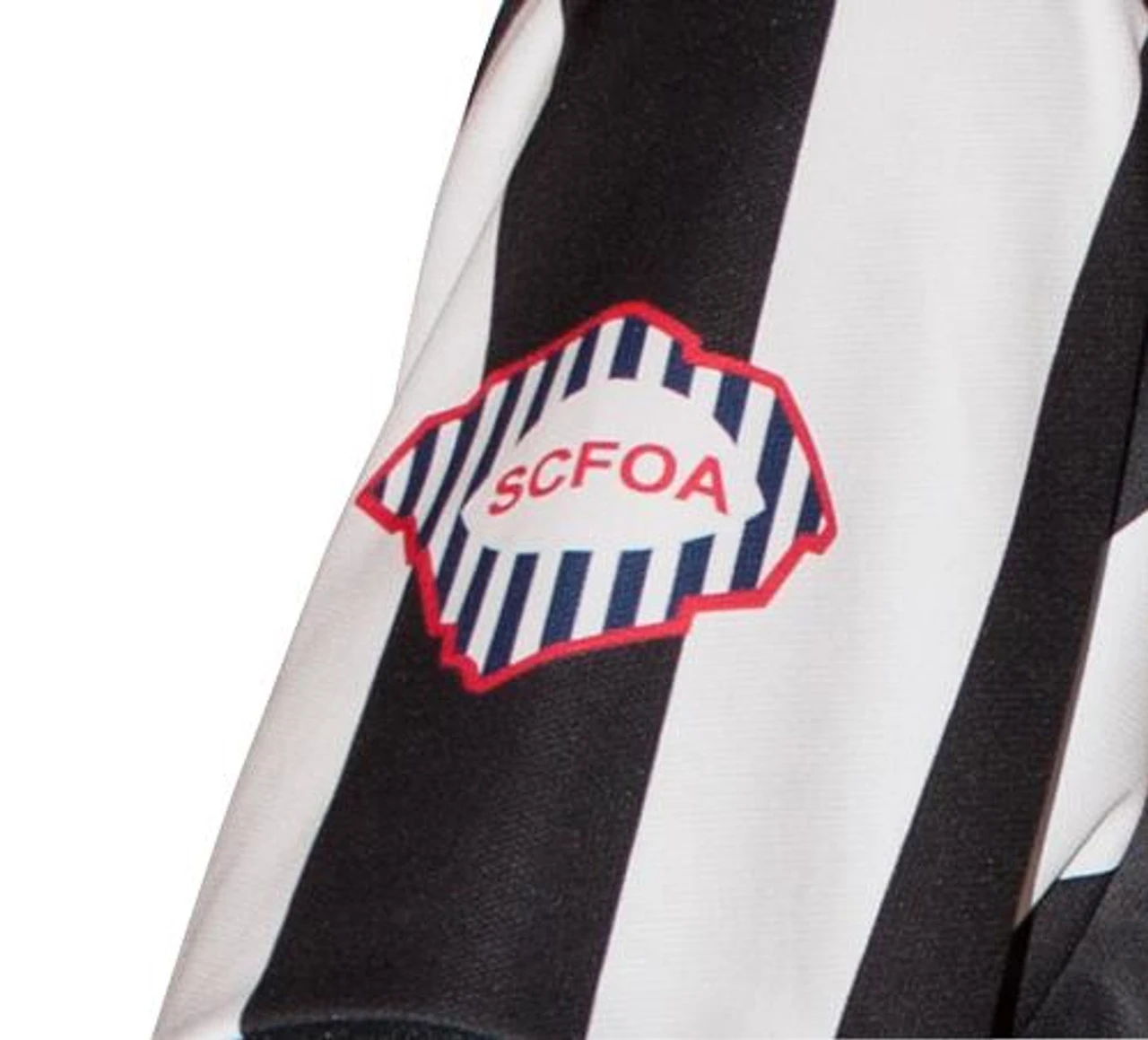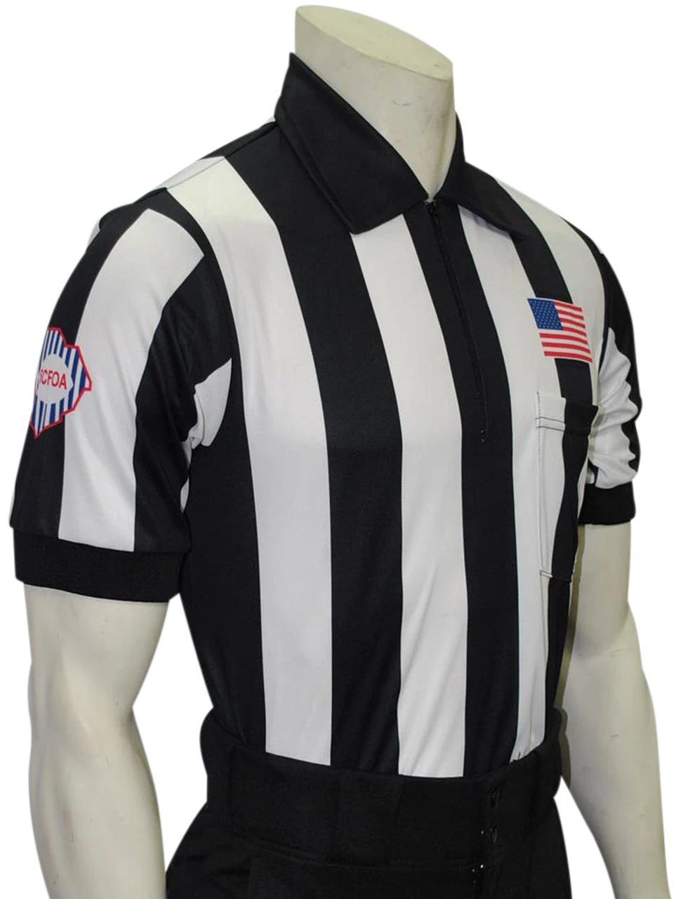 SCFOA logo dye-sublimated on the sleeve and a white border US Flag dye-sublimated above pocket. Made with 100% performance mesh fabric. Features a 2 1/4″ stripe pattern. Self fabric collar and rib knit cuffs. Smitty USA has become the leader in manufacturing of dye sublimated shirts for sports officials nationwide. All Smitty Apparel products are designed by one of the top officials in the world, for officials. Made In The USA.