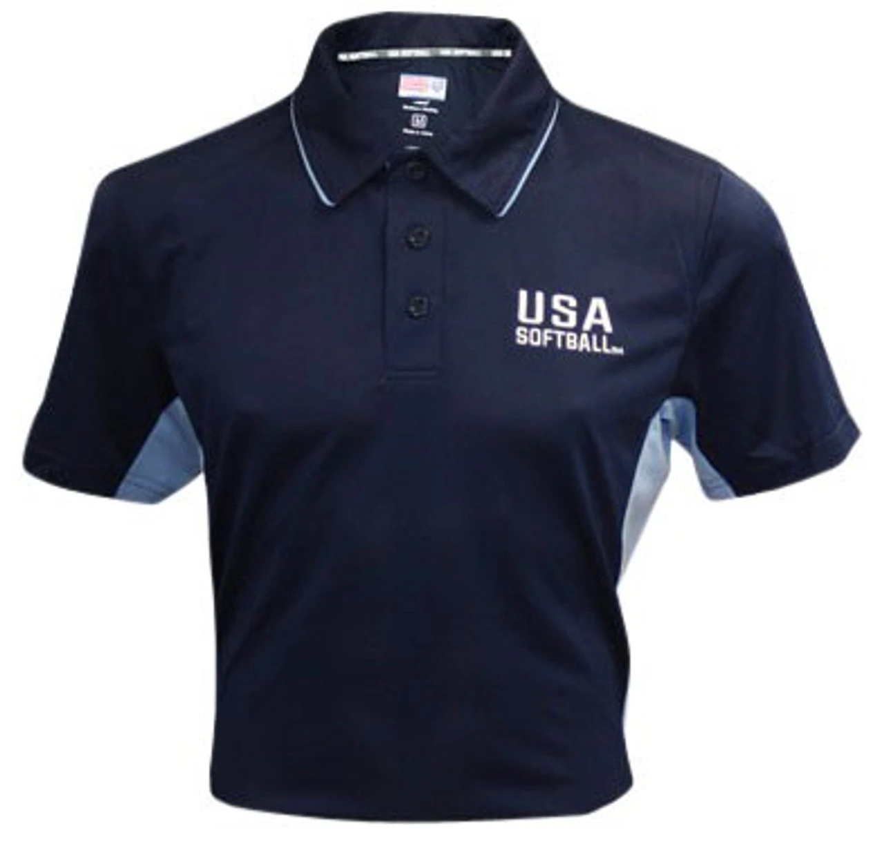 USA Softball Navy Blue Umpire Shirt. Official umpire shirt of USA Softball. Navy Blue with powder blue side panel. Self styled collar with powder blue trim accent. Performance polyester fabric wicks sweat away from your skin to keep you dry. Wrinkle free for easy care.