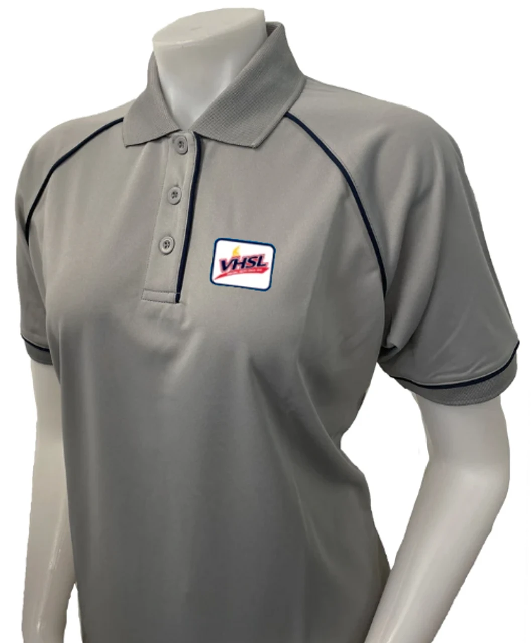 Grey polo shirt that is just perfect for volleyball. Virginia VHSL logo on the left chest. Ribbed collar. Our premium 100% premium polyester with 3 button placket and color matching buttons. Extended tail with side vents. Moisture Management fabric offers advanced technology to keep you cool, dry and comfortable. This specially engineered fabric contains properties that transports moisture away from the body, without sticking to the skin, creating a natural system for moisture evaporation. It also features anti-bacterial treatment to assure freshness.